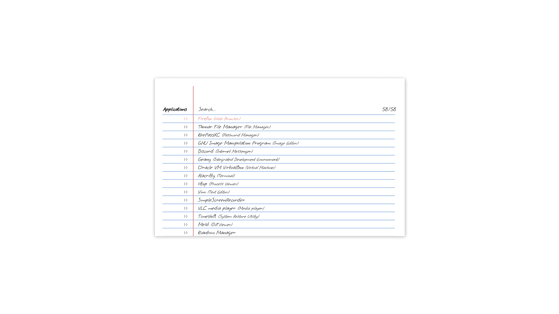Apps Favorite or most used Applications alacritty, thunar, geany, firefox, ncmpcpp, xfce4-settings-manager